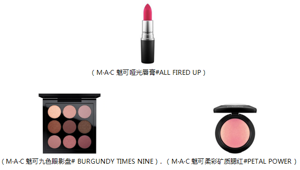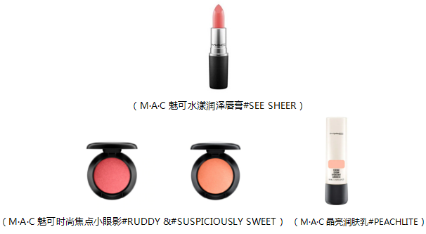 公孙离的妆容由火箭少女101成员孟美岐演绎。以蜜桃色的M·A·C晶亮润肤乳打底,M·A·C水漾润泽唇膏#SEE SHEER彤枫色一抹上唇,质地水漾润泽,犹如缤纷枫叶在双唇间舞动,瞬间元气全开不掉线。酒红色闪亮丝光质地的时尚焦点小眼影搭配带细闪的珊瑚橘色色泽饱满,柔和晕染,演绎阿离满满元气,俏皮尽在那明眸眨眼间。