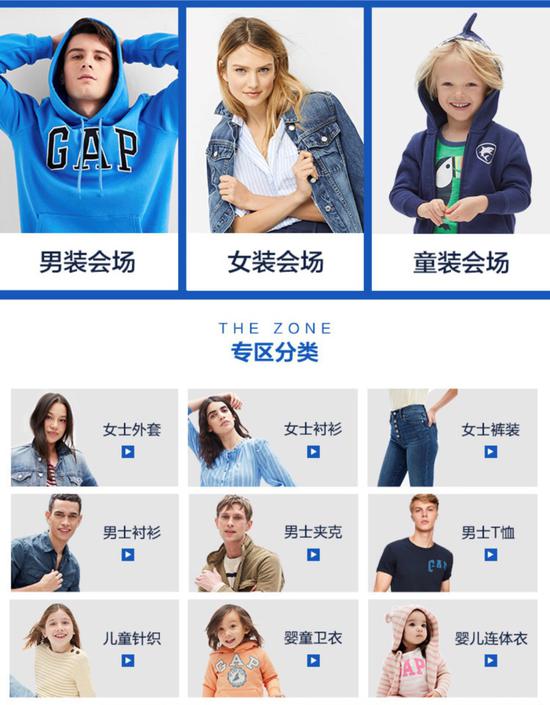 GAP全线产品均参与活动,并贴心做了简单明了的分区。按群体分了男装区、女装区和儿童区;按分类设置了春夏特惠、3折封顶、爆款专区等。方便用户准确找到自己所需的产品。