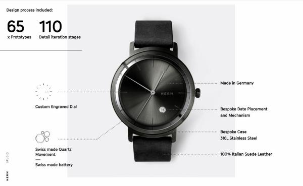英国设计、德国制造赋予HERM Studio腕表与生俱来的时尚感和高品质。HERM Studio腕表设计过程经过65次原型制作、110次细节打磨,最终为您呈现不同凡响的定制镌刻表实盘、瑞士制造石英机芯和电池、定制日期窗口装置、316L不锈钢定制表盘以及100%意大利山羊皮。独具匠心的设计过程,让HERM Studio腕表保持了强烈的个性风格,足以吸引最具影响力的时尚人群的注意。