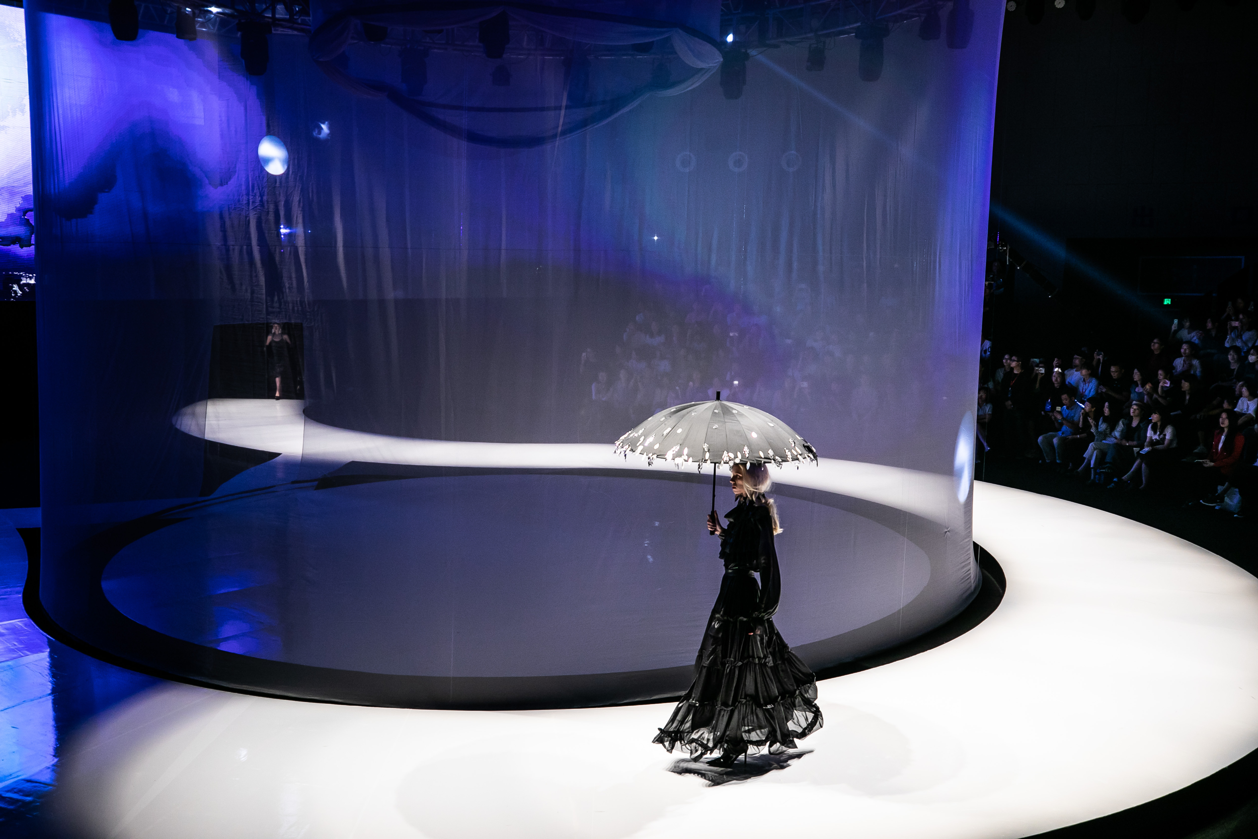 “浪漫邂逅——巴黎&米兰时装联合发布秀”上,Angelo Cruciani带来了他的全新设计。Angelo Cruciani说:“雨对于我来说,是诗一样深意的时刻,是生命之水从天而降给予我们生活的时刻,这个带有魔力却有时黑暗的时刻创造了美,我的想法是给穿着它的人们带来生的希望”,所以把本次设计主题命名为“AFTER EVERYTHING——后来”。本次秀演展出近40组造型,天空元素将代表着细微差别和壮观表现的隐喻,从而展现一种积极向上的力量。整个秀场通过灯光投射出的交叉光柱,空间中央遍布纱幔以及相互交错的灯光,让人仿佛置身充满灯光的海洋。每一个全身心投入的时尚看客表示真的很想穿上Yezael的新系列,在这个空间中来一次旋转跳跃的疯狂美式迪斯科!Angelo Cruciani 通过服饰和场景设定成功让这场秀变成一场从困难走向幸福的变革。