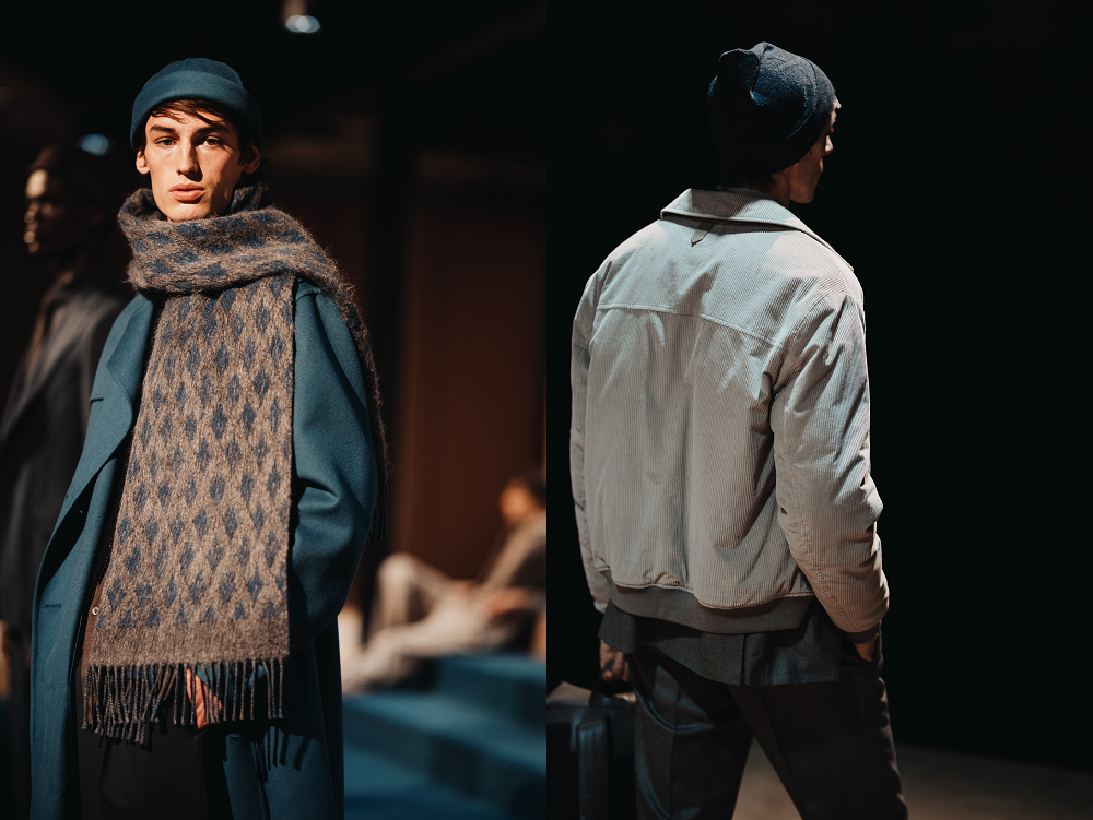 CANALI 2025秋冬系列向发源地布里安萨(Brianza)致敬,这里既是CANALI的意式精神根基,同时也以高端家具制造业闻名——从地板图案和家居纹理,到不同材质组合——以空间设计启发时装灵感,正如兼顾室内和户外的闲适生活方式,家居服饰的舒适轻便也引入绅士户外衣橱。通过融合不同纹理和细节元素,本季的休闲正装风格得以呈现,将舒适从容的居家风格融入多款单品。束腰腰带大衣线条利落、形似长袍,与双面风衣和轻盈的套装同样质地柔软。针织衫和外套选用多尼戈尔粗花呢,这种材质常被用于沙发或枕头装饰等家居单品中;灵感源自镶嵌地板的菱格图案则转化为提花,使用于套头衫和围巾等实用单品。
