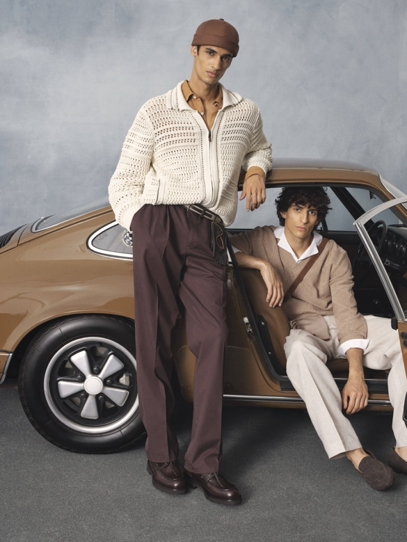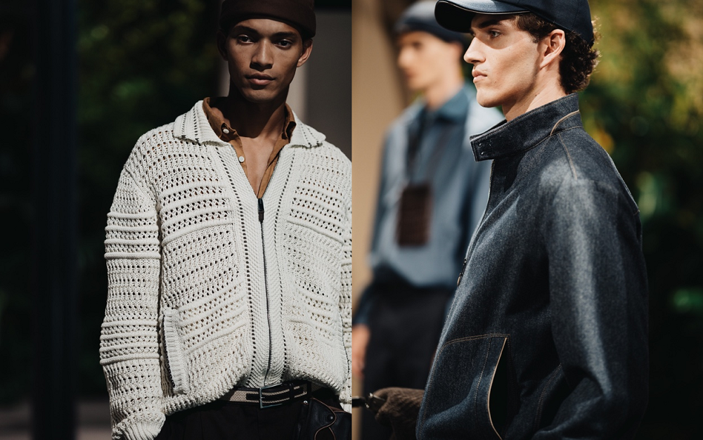 廓形松弛有致,剪裁合身自如。CANALI标志性的轻盈材质与精致剪裁贯穿始终:从西装、休闲西装,至Nuvola系列的麂皮风衣与飞行员夹克皆轻盈若羽,穿着如衬衫般轻松自在,以轻、柔质感,配合绅士每一次驾乘。工装外套与衬衫、裤装混搭,精仿羊毛面料或高性能Impeccabile材质也可如丹宁般挺括、实穿。衬衫夹克与外套系列以编织皮革饰边点缀,灵感直接源自车轮的毂罩设计;驾驶手套的钩针纹理则化为针织衫图案。功能性与奢华感在科技面料外套中达成平衡,标志性的Freccia箭头图案则以大小提花跃现于polo衫与圆领针织衫。晚装系列慵懒中带一份飘逸,更以色调突破常规。