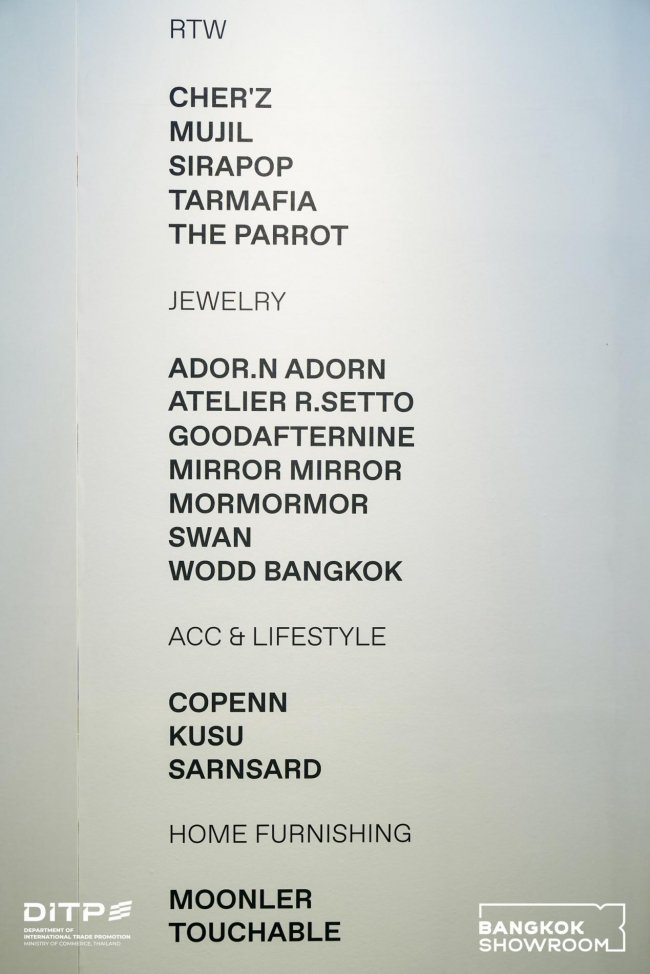 参展品牌包括:SIRAPOP、MUJIL、TARMAFIA、THE PARROT、CHER'Z、MIRROR MIRROR、ATELIER R.SETTO、ADOR.N ADORN、GOODAFTERNINE、SWAN、SARNSARD、WODD BANGKOK、MORMORMOR、KUSU、COPENN、TOUCHABLE、MOONLER集中展现泰国设计在匠心传承与先锋创意之间的独特平衡。