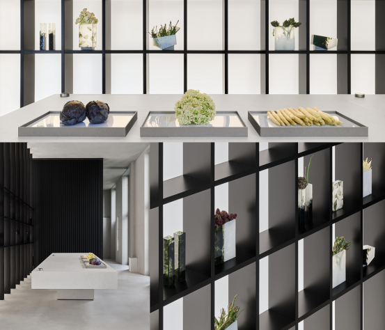 装置的核心是一张长条形雕塑感餐桌,它既是舞台、操作台,也是交汇点。桌面搭载瑞族V-ZUG新品Integra系列隐形电磁灶,将感应技术嵌入由纯净天然矿物打造的连续台面之中。技术退隐于无形,只在你需要时温柔显现,灶具、料理台、餐桌三重场景,在不同场景需求中无缝切换。
